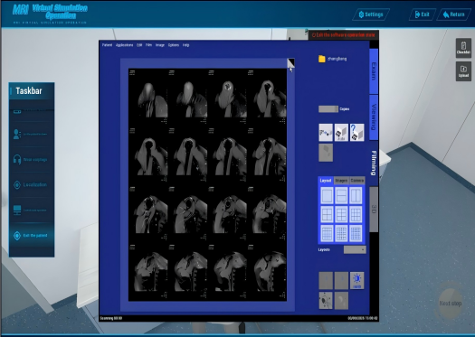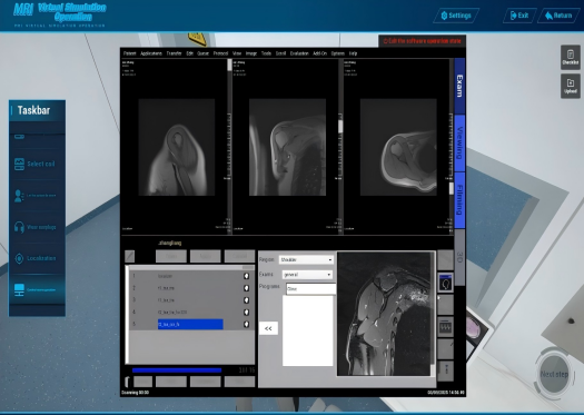 2.システムは一人称視点でMRI装置の撮影を行い、キーボード+マウスによる操作を実現。標準的な3D検査室とコントロールルーム環境を備え、三次元装置の配置は実際の病院環境と一致し、学習者が操作中にリアルな操作環境を体感できるように設計されています。