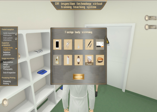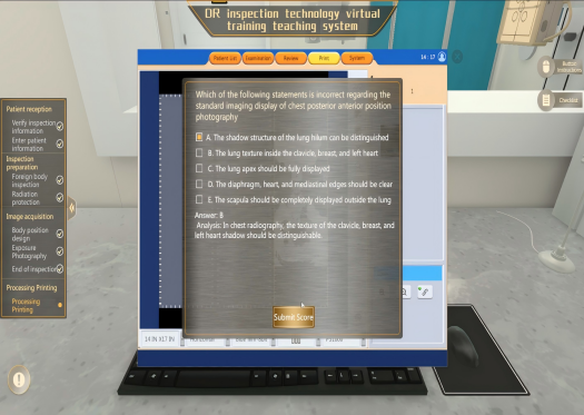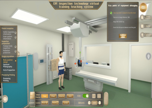 コンピュータ技術を用いた仮想シミュレーションにより、医療用X線DR胸部検査を実現し、効果的な教育管理と教育活用を行う。仮想実験では学生の参加状況を記録し操作効果を評価できるため、人と機械のインタラクティブな実験効果が得られる。学生は反復訓練や実験設計が可能であり、これにより創造的思考力と革新的な実験技能を向上させることができる。
