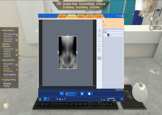3.システムを通じてDR撮影時の体位調整、装置調節など完全なプロセスをシミュレート可能。システム内のDR装置は臨床実機を完全に模倣し、操作ボタンは実際にクリック操作が可能です。